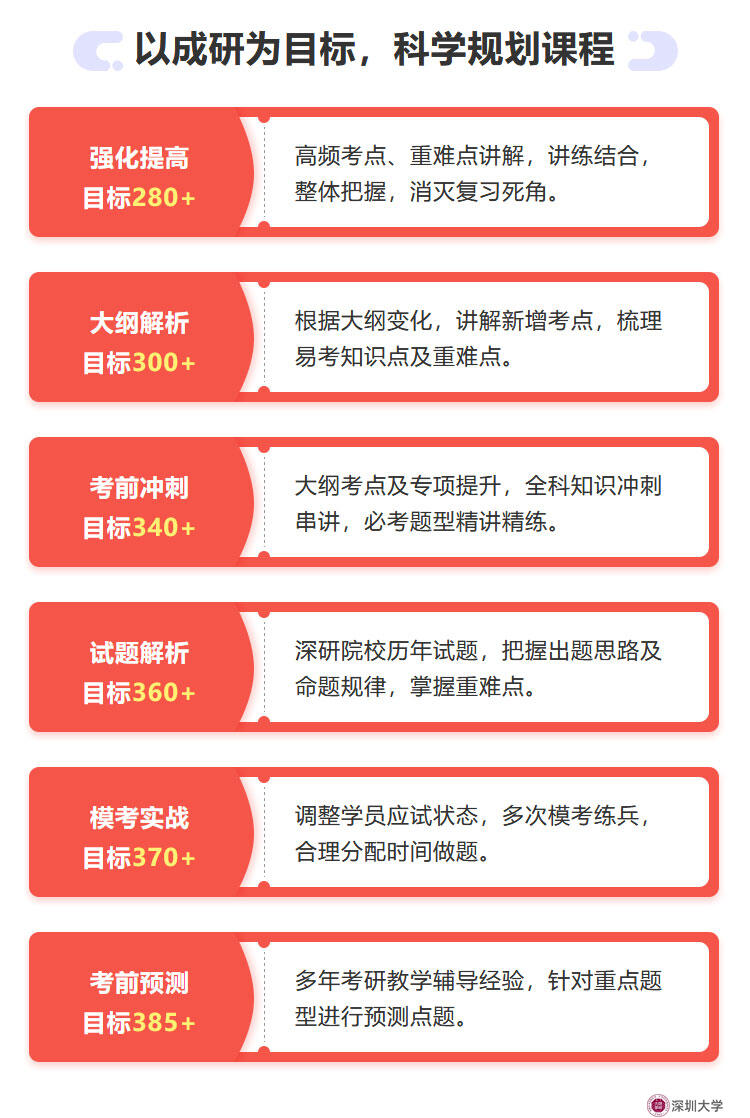 依托深圳大学的核心资源,在历届深圳大学体育学考研学长,学姐的协助下,精心研发与实践,推出国内针对深圳大学体育学考研学子量身打造的精准高效考研辅导班课程体系,在这里没有难考的研究生!