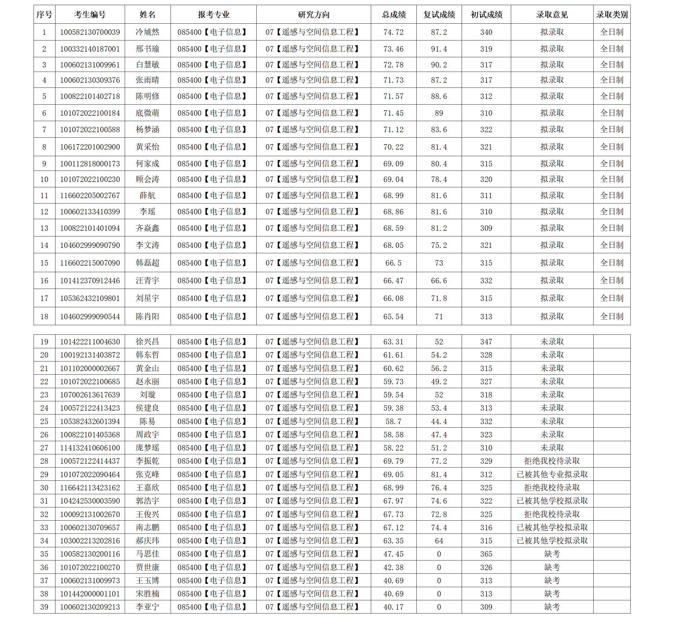 根据教育部、河北省教育考试院的有关文件规定,依据学校《2022年硕士研究生招生复试录取工作办法》,我校遥感信息工程学院于4月8日-9日组织了电子信息专业第一批调剂考生复试,现对复试综合成绩及拟录取情况进行公示。本专业计划缺额26人,本次调剂复试拟录取18人。对拟录取结果有疑义者可在公示期内具名反应,监督举报电话:0316-2083654。